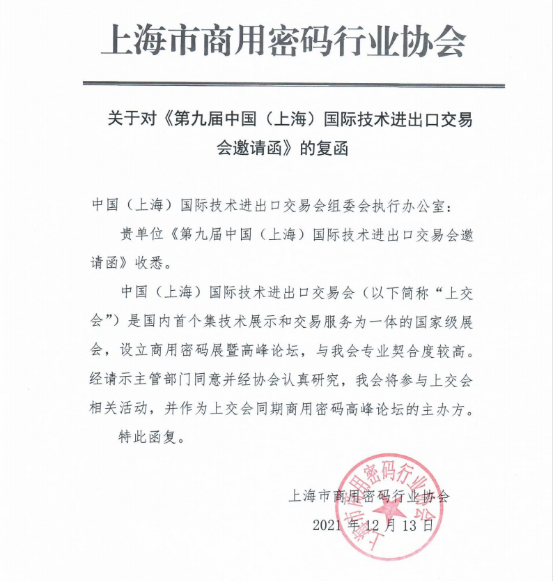 为了贯彻落实习近平总书记总体国家安全观的重要论述,提升保障网络与信息安全的核心技术、强化基础支撑,第九届中国(上海)国际技术进出口交易会响应数字化发展战略要求,围绕城市数字化应用场景,构建智慧城市安全保障体系,首次设立商用密码展区,将云集行业专家、知名企业、政府部门和应用场景合作伙伴,共同推动数据安全和数字产业化发展。
